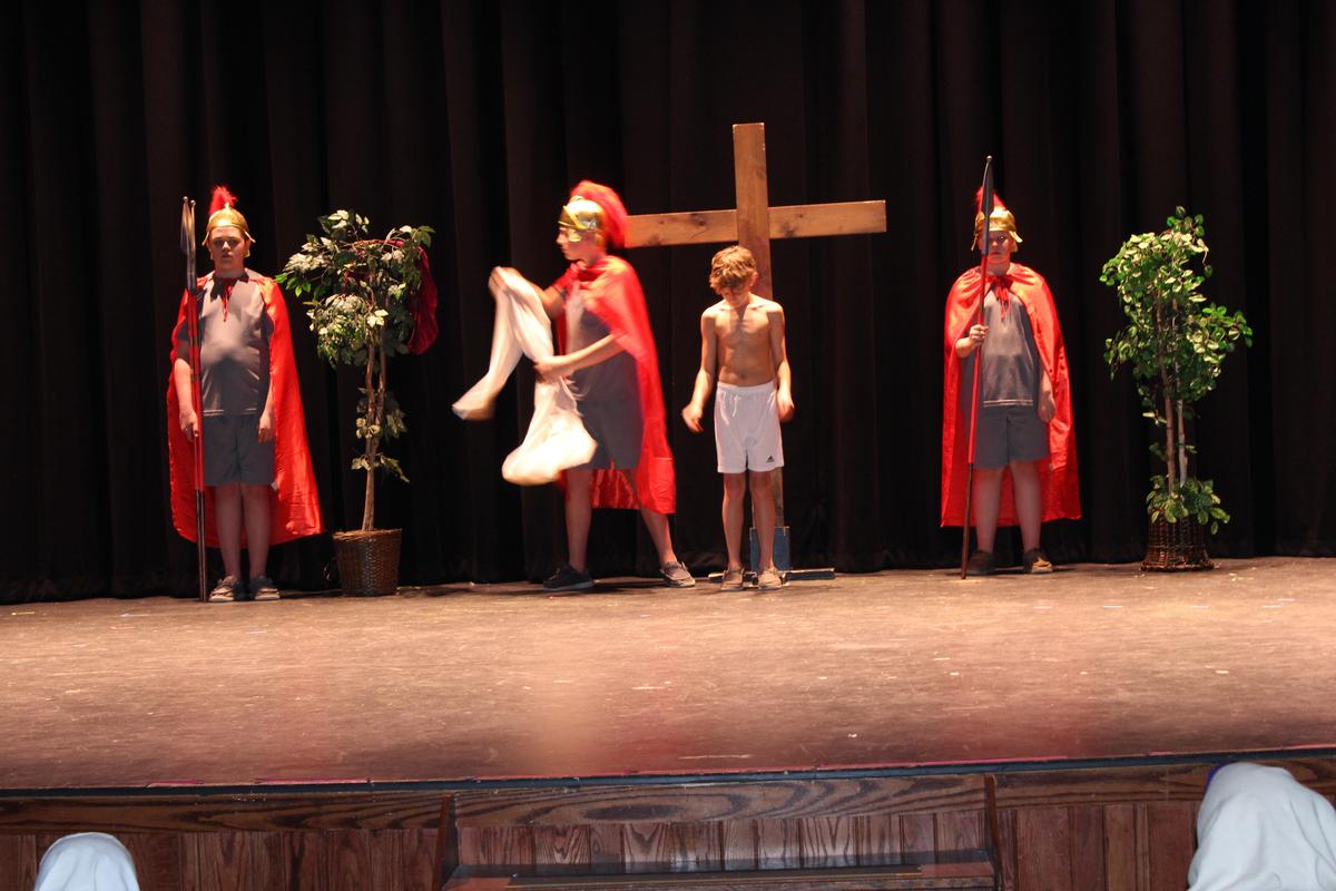 Snyder adds, “We begin practicing right after Christmas and practice daily through Holy Week. Each and every year, the 6th grade students put their entire heart and soul into re-enacting the Stations of the Cross. The students learn the horrific betrayal and death endured by Jesus, and how his dying on the Cross has saved all of humanity. It is fascinating to see how much the students learn through re-enacting, and how very proud they are to be able to perform 4 times throughout Holy Week.